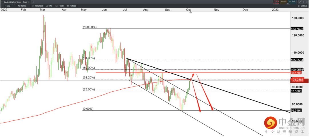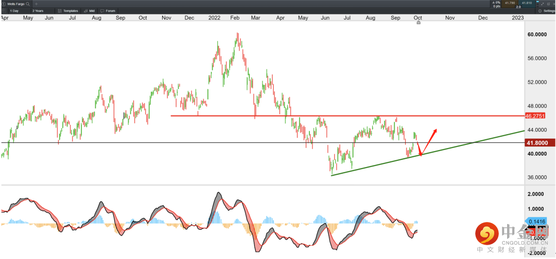 富国银行将在周五美股盘前公布第三季度财报,鉴于美国抵押贷款利率在连续加息的背景下升至20年来的高点,抵押贷款规模或将在第三季度进一步收缩,基本面的增速放缓也直接反映在股价上。富国银行自2月的高点59.75震荡下跌,累计最大跌幅达到39.3%。目前价格相较于7月的36.24略有回升。从结构上,当前需关注下方的重要支撑40附近,若失守该点位,价格或进一步向下延续。若出现反弹,价格有望挑战上方阻力46.3。
