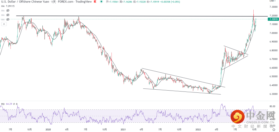中美两国10年期的基准利差目前倒挂120个基点,处于2007年以来的最大差值水平。考虑到美联储激进加息政策的推进以及中国央行偏宽松的货币政策,利差或将继续走扩,再加上中国近期偏弱的经济数据,美元兑离岸人民币冲破7.20可能只是时间问题。20MA可以在下方起到不错的支撑作用。