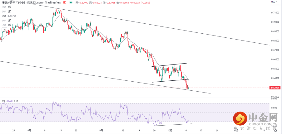但值得注意的是,最新的期货持仓报告显示,澳元的投机性空头头寸已经减少至2021年7月以来的最低水平。再结合RSI指标出现的背离信号,并不能排除短线反弹的可能,一直起到压制作用的21EMA可以作为反弹高度的参考。
