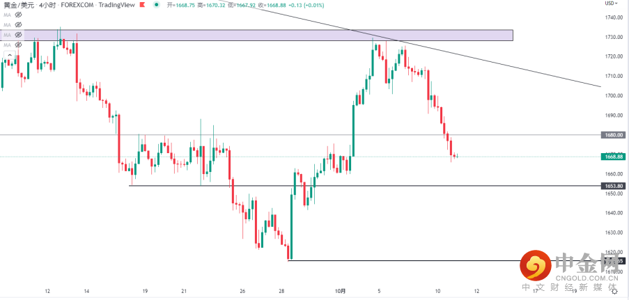 目前金价重新回到自历史高点以来的下降通道内部以及50日均线下方。若趋势延续空头或将测试1654一线,这里也是9月末至10月初反弹的61.8%回档位,想要再次下探前低1615则需要看到本周四CPI数据大幅好于预期。上行方向,1680是多头的首要目标,这里是前期重要的支撑阻力转换位。