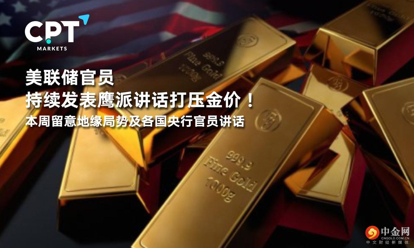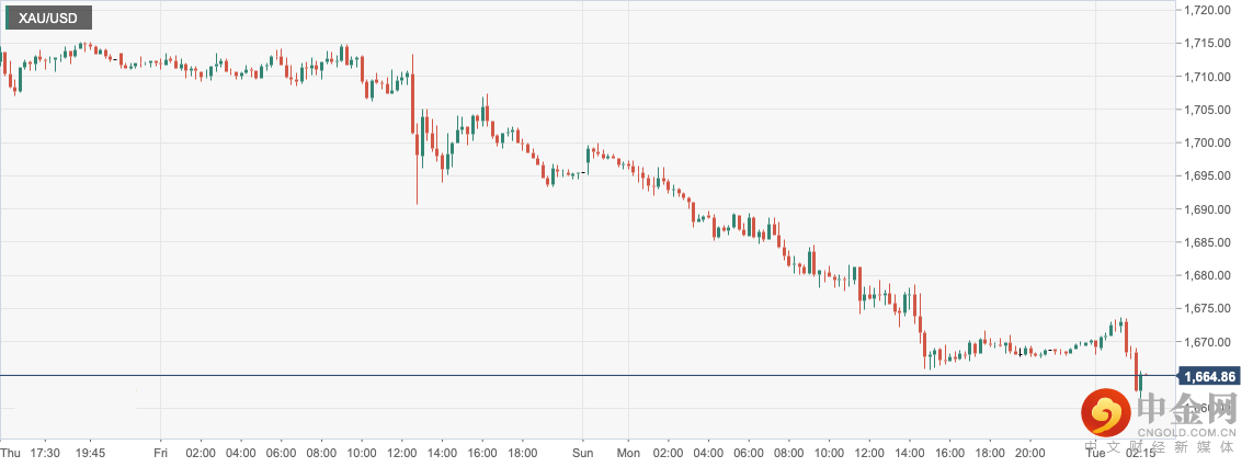 黄金兑美元周一盘中大幅下跌后,今日开盘跌至1664.86附近,因美联储官员持续释出鹰派立场,帮助美元指数录得四连阳,导致金价下行震荡疲软。