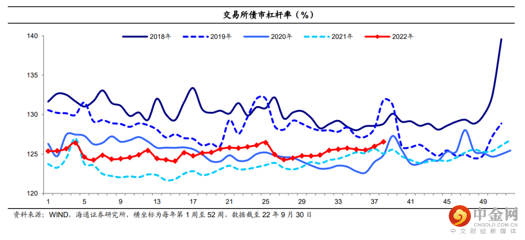 (7)从交易所债市杠杆率来看,交易所杠杆率继续上行。至9月30日当周交易所债市杠杆率为126.6%,环比继续上行0.6个百分点、同比继续上行1个百分点。