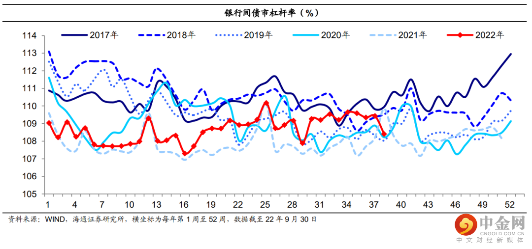 (6)银行间杠杆率季节性回落。至9月30日当周银行间债市杠杆率为108.4%,环比下行1.03个百分点、同比为4月8日以来首次下降1.43个百分点。