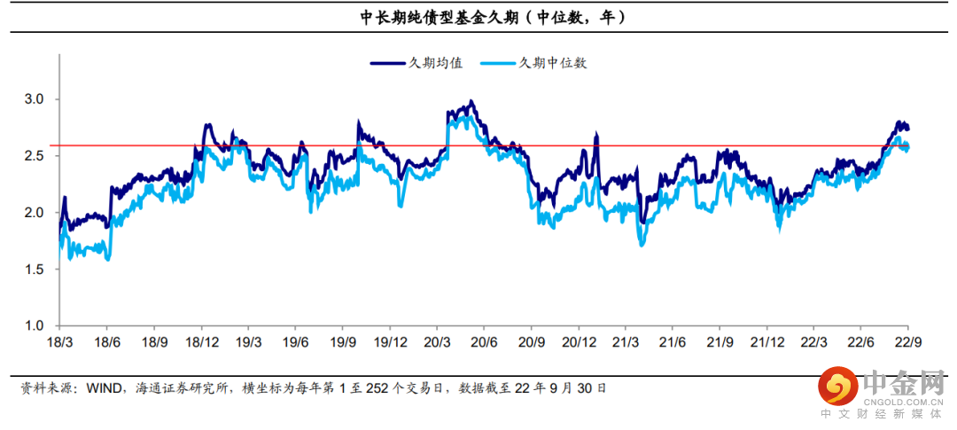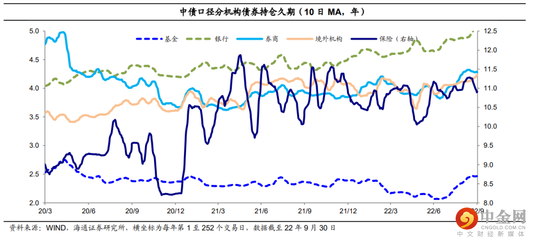 中长期纯债型基金久期(中位数,以周五为基准)/中债口径基金、银行和券商的债券持仓久期。