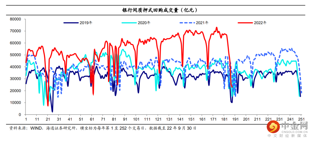 (5)质押式回购成交量&隔夜占比均大幅下降。从质押式回购成交情况来看,受跨季跨节影响,其周均值环比大幅下行至4.97万亿元、其中9月30日质押式回购日成交量回落至2.6万亿元,周度隔夜回购成交量占比均值环比下行18个百分点至72%。