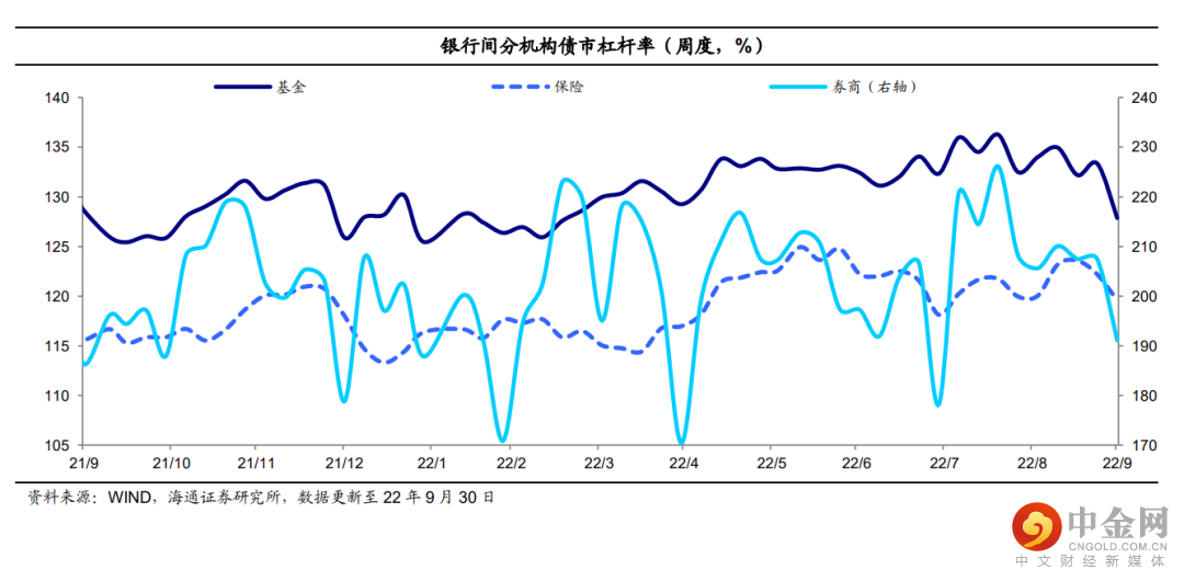 银行间债市杠杆率,基金(创今年3月末以来新低)、保险和券商环比均降杠杆。