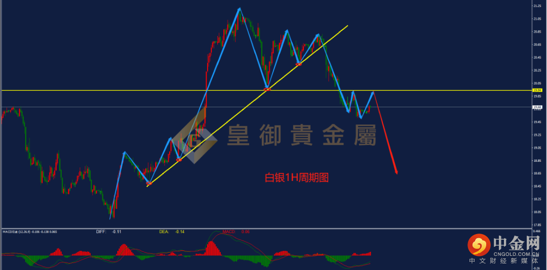 从下方的白银1小时周期图来看,白银此前进行延续上涨,走出高低点逐渐上移的上涨形态并构建上涨趋势线。上周,白银在触及上方21.22附近压力后迎来调整,行情2次向下测试此前上涨趋势线支撑后于周五晚间向下突破此前上涨趋势线。当前从形态上来看,白银成功下破此前震荡区间,并反弹区间底部压力19.93一线不过。从指标上来看,MACD指标的DIFF与DEA双线成功下穿0轴,空头动能呈现放量形态,预计白银后市大概率将进行延续下跌。日内操作建议以逢高做空为主,可于上方关键压力19.93一线进行入场。