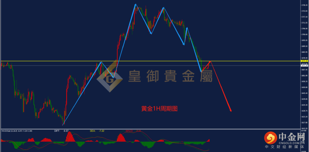 从下图的黄金1小时周期图来看,黄金于此前向上触及1729一线后迎来顶部震荡,构建“M顶”形态并向下突破颈线附近。在反弹确认颈线压力后黄金于昨日延续下跌,当前行情跌至1665一线后迎来支撑进行调整。从指标上来看,MACD指标的空头动能呈现放量形态,且DIFF与DEA双线成功下穿0轴,预计行情后市大概率将延续进行下跌。日内操作建议以高空为主,可于上方关键压力1675一线进行入场。