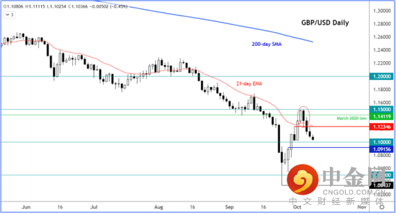 英镑/美元汇率无力实现反弹复苏,现在甚至跌破几个关键技术位,最小阻力之路仍朝下行。一旦突破1.10,下一潜在支撑位将在1.0915附近,而这是此前的阻力位。一旦政策放松,就可能面临英镑/美元再度下探1.05的风险,甚至有可能继续下跌,再次测试九月底低位1.0345。
