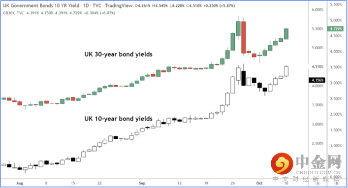 30年期国债收益率攀升至新高4.75%,接近干预措施前的峰值5.12%。10年期国债也接近近期新高: