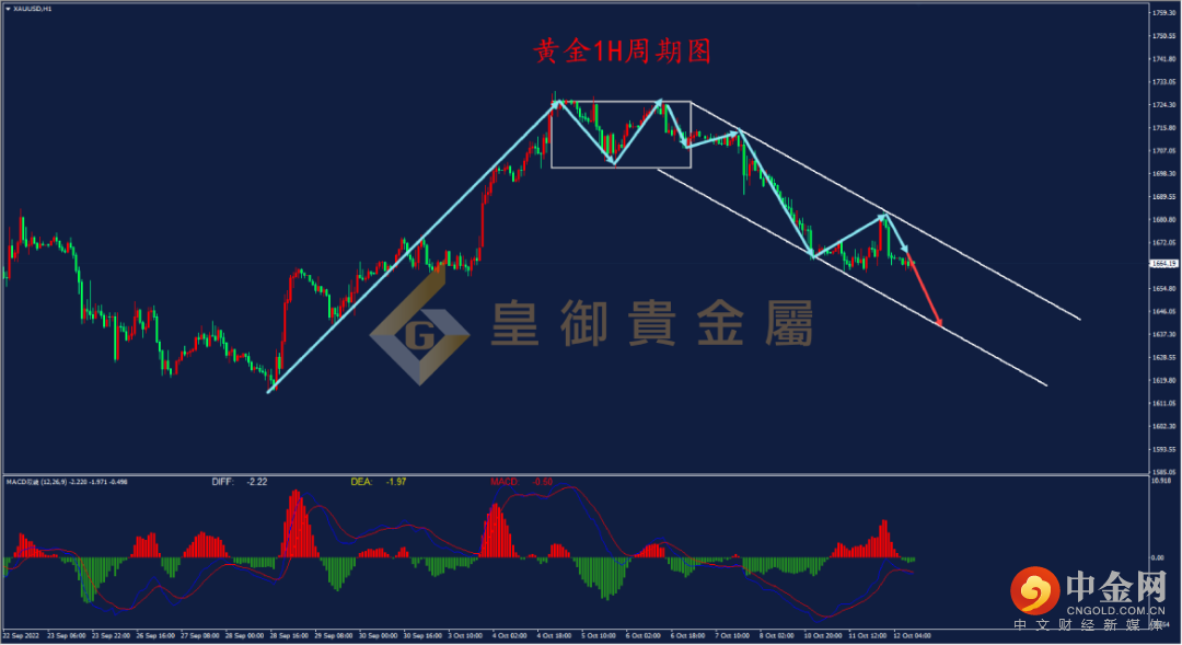 黄金昨日冲高回落,走出V形反转。从1H周期走势结构看,黄金在1725.0附近构筑双顶形态,随后延续下跌,目前来看空头走势仍在延续,后市较大概率延续下跌,操作上可继续关注空单机会。结合MACD指标来看,DIFF线与DEA线处于零轴下方,表明空头力量偏强。日内操作可参考上方压力线1672.0附近尝试空单,目标下看1650.0附近。