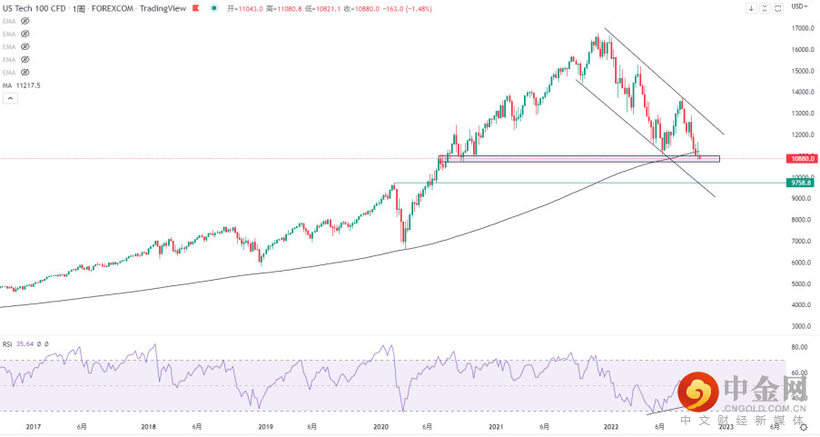 周线图上来看,纳斯达克100指数正面临着“生死抉择”的时刻!目前指数正在200周均线附近苦苦支撑,并且再次从前高回落了超过20%重回熊市。图中10670-11000的支撑区域接近疫情后这波牛市涨幅的61.8%的回撤位,若无法守住恐将进一步退守至9800,随后疫情初的低点6637一线就将进入空头视野。