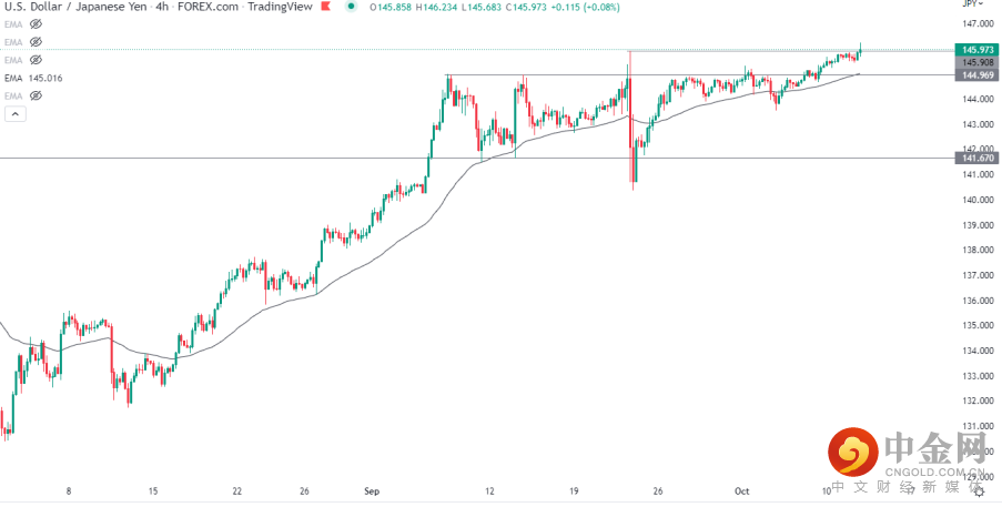 美/日周三早盘突破了146大关,刷新1998年以来的最高水平。从过去几周的情况来看,日本央行的干预似乎无法阻挡日元的贬值。目前所有均线呈多头排列,两国的利差以及避险情绪或将继续推升汇率。就像我们周一的分析 中提到的,下一个目标为147.62。若看到短线回撤或许会在关键均线位置获得支撑。明天的美国CPI数据会助多头一臂之力吗?