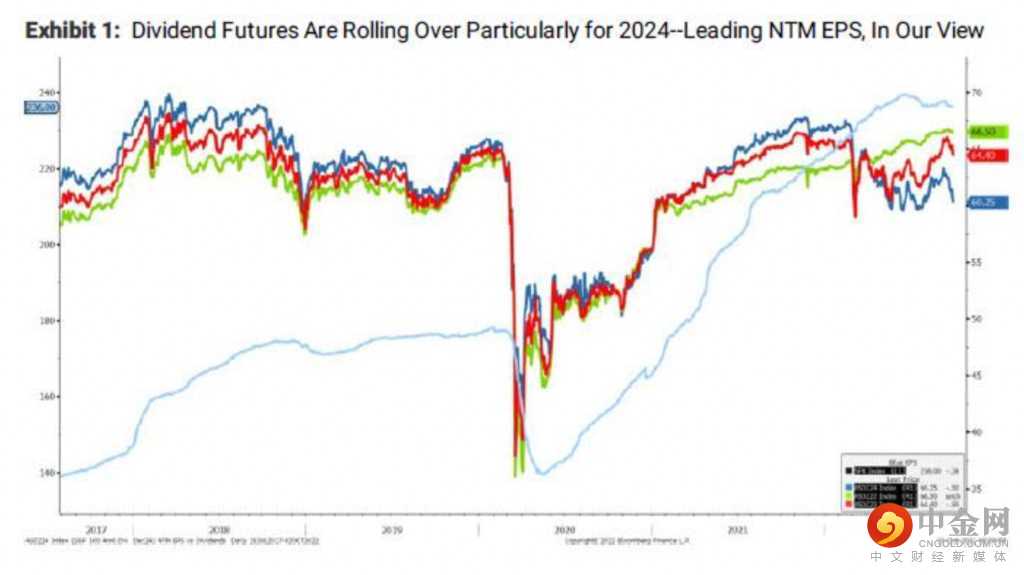 Wilson在股息期货市场观察到,即使远期每股收益预测仍保持上行趋势,股息期货交易也出现大幅下滑。(下图中,深蓝色线、红线、绿线分别为2024、2023、2022股息期货;浅蓝色线为远期每股收益)。