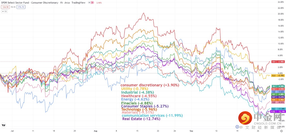 过去三个月标准普尔500指数中11个板块的表现