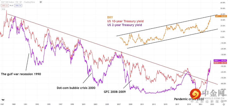 因美联储保持强硬的鹰派立场,美元指数上升到20年高点,2年期美国债券收益率飙升至4%以上。如下图所示,金融危机通常发生在债券收益率下降时,即2年期国债收益率低于10年期国债收益率时。简而言之,在债券收益率倒挂结束后,美元指数通常在经济衰退期间和降息周期下跌,这意味着虽然美元兑其他主要货币很可能在第四季度大部分时间保持在高位,但在触及通道阻力位时可能很快就会回落。在当前水平的基础上下跌5%-6%是可能的,今年剩下的时间可能在109-115之间波动。