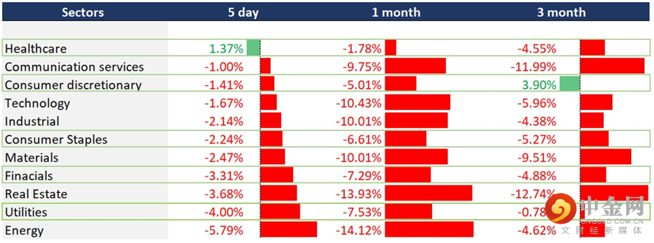 图表显示,绿色边框的板块在过去三个月和最近表现出色,其中医疗保健和非必需消费品是最具弹性的板块,其次是必需消费品、金融和公用事业。