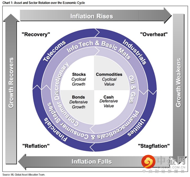 根据著名的美林投资时钟(Merrill Lynch Investment Clock),在“滞胀”周期,资产类别的选择开始从大宗商品转向防御性类别,这意味着能源股可能将逐渐面临抛售。而防御类股票,如消费必需品、医疗保健和公用事业等,可能会领跑大盘。此外,金融和非必需消费品可能也是逢低买入的机会。