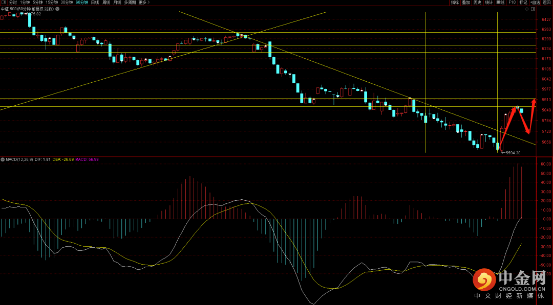 中证500短期已经再次回到前期六十分钟中枢平台,后续需要放量突破中枢上沿5930才有望开启新的趋势段落。在没有突破之前上涨空间相对有限,注意把控好低吸节奏。