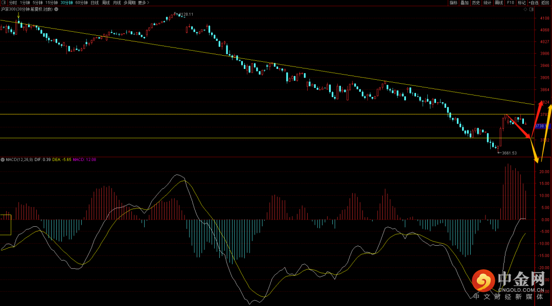 沪深300三十分钟底背驰结构大致完成,注意观察下方3700附近支撑,在不跌破这个位置之前大概率还会有再次的向上走势出现。