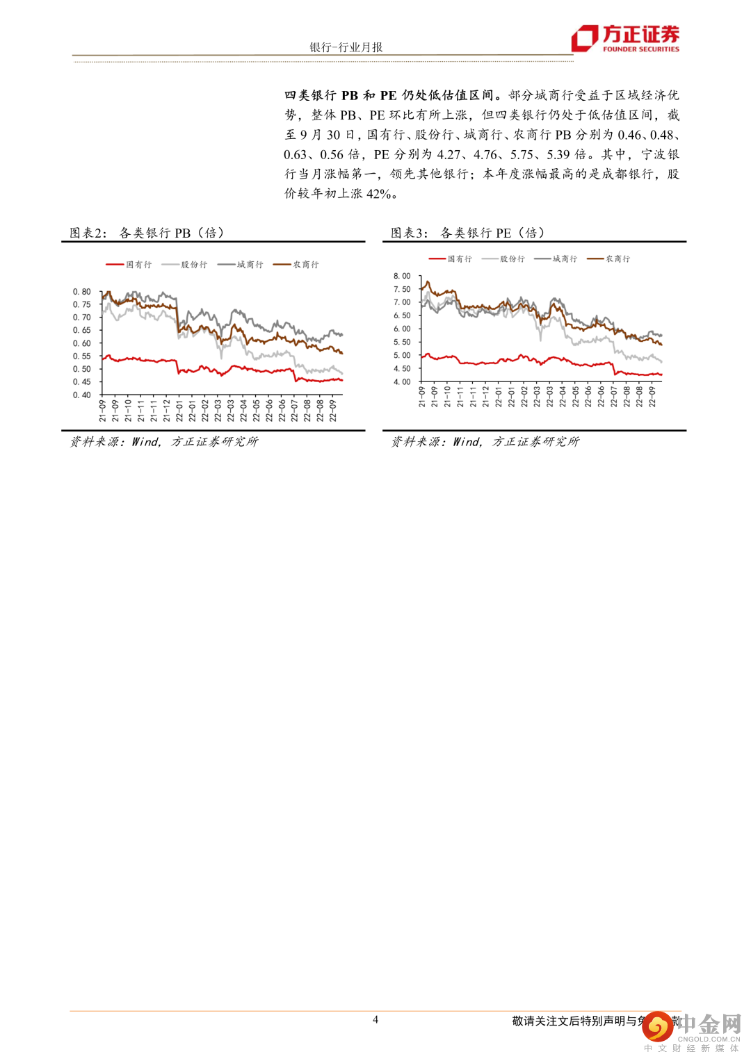 银行股仍处低估值区间。部分城商行受益于区域经济优势,整体PB、PE环比有所上涨,但仍处于低估值区间,截至9月30日,国有行、股份行、城商行、农商行PB分别为0.46、0.48、0.63、0.56倍,PE分别为4.27、4.76、5.75、5.39倍。