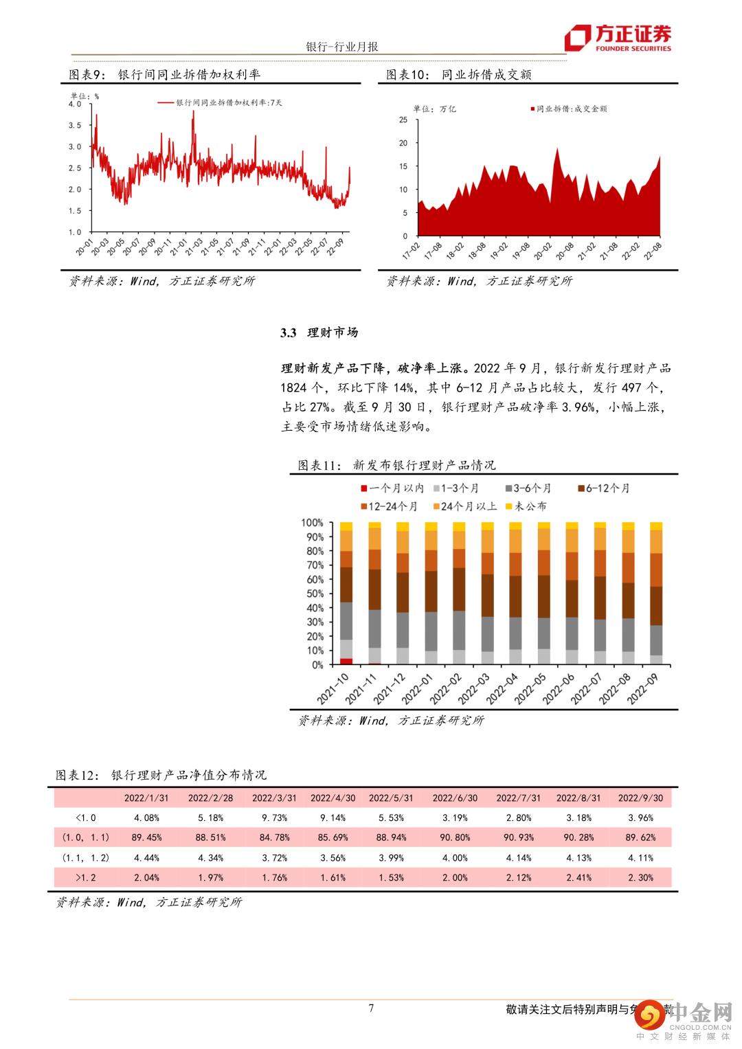 理财新发产品下降,破净率上涨。2022年9月,银行新发行理财产品1824个,环比下降16%,其中6-12月产品占比较大,发行497个,占比27%。截至9月30日,银行理财产品破净率3.96%,小幅上涨,主要受市场情绪低迷影响。