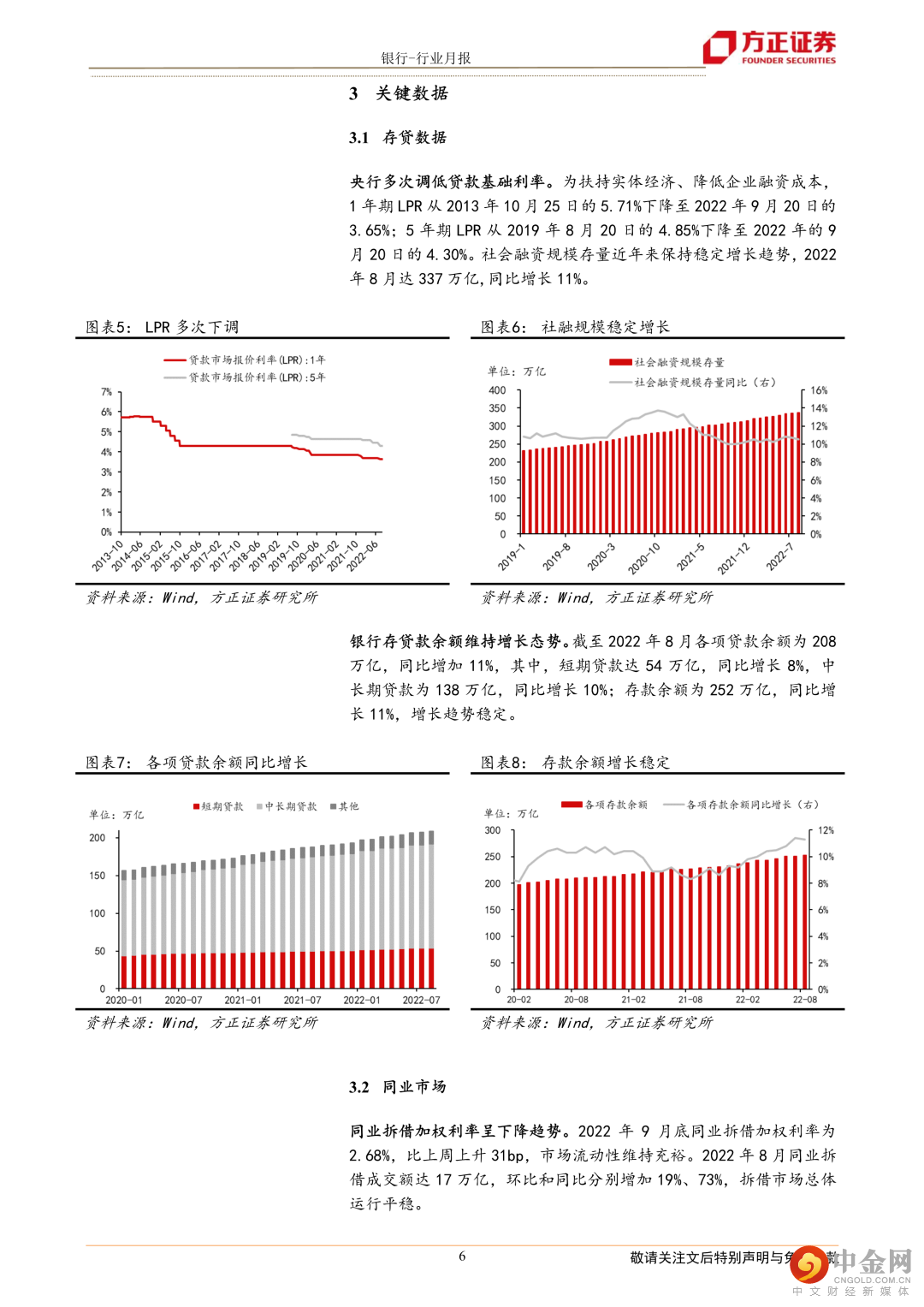 贷款利率调降,存贷款余额稳定。为扶持实体经济、降低企业融资成本,1年期LPR下降至3.65%;5年期LPR下降至4.30%;截至2022年8月各项贷款余额为208万亿,同比增加11%,存款余额为252万亿,同比增长11%,增长趋势稳定。