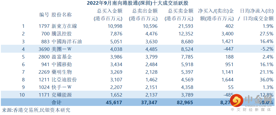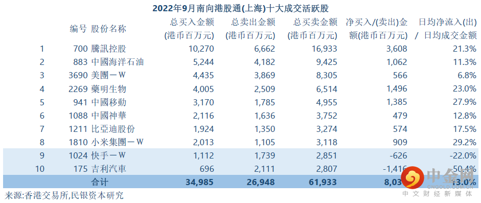港股通(沪港通及深港通)南下买卖港股十大成交活跃股可参考附表。2022年9月份沪港通及深港通南下买卖港股十大成交活跃股总体表现与7-8月份好淡争持局面有所差异。2022年9月份沪港通及深港通南下买卖港股分别录得净流入80.4亿港元及82.7亿港元。2022年9月份沪港通及深港通十大成交活跃股日均净流入/日均成交金额分别为13.0%及10.0%,较同月港股通整体8.8%为佳,显示权重股更受内地资金靑睐。另一方面,沪港通及深港通南下买卖港股十大成交活跃股9月份分别只出现2只净流出股份,与7-8月接近一半股份录得净流出大相径庭。