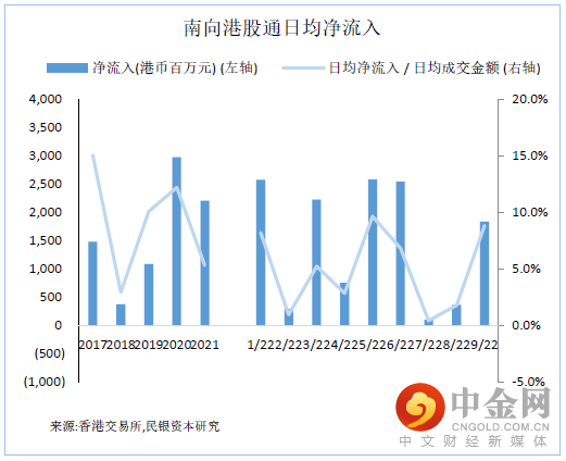 从买卖净额计算,透过港股通(沪港通及深港通)南下买卖港股日均净流入于2017年约为14.8亿港元。虽然该指标于2018年下跌至3.7亿港元,但2019年飙升近两倍至10.8亿港元,2020年再上涨超过近两倍至29.7亿港元。虽然该数字于2021年同比下跌约25.8%至约22.1亿港元,但透过港股通南下买卖港股从2014年推出以来连续第八年录得日均净流入,为投资港股资金池提供额外来源。2017-2021年日均净流入/日均成交金额比例分别处于15.0%、2.9%、10.0%、12.2%及5.3%,平均为9.1%。