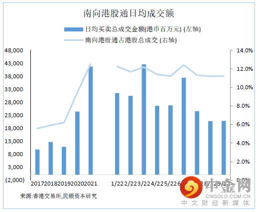 透过港股通(沪港通及深港通)南下买卖港股日均买卖总成交金额从2017年98.2亿港元上升29%至2018年127.1亿港元。虽然该指标于2019年稍为回落至107.9亿港元,但2020年同比上升126%至243.7亿港元,2021年再显着上升71%至417.1亿港元。2017-2021年南向港股通日均买卖总成交额占港股总成交额分别处于5.6%、5.9%、6.2%、9.4%及12.5%,该指标于2017-2021年持续上升。