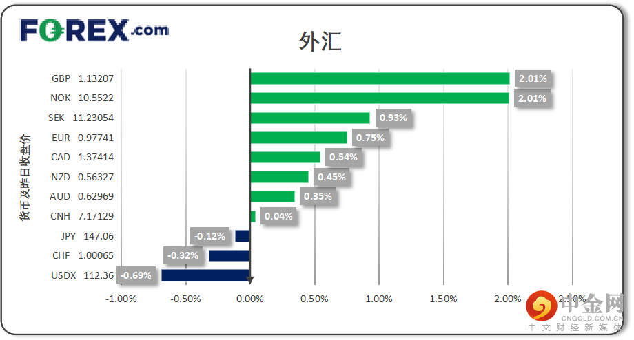 三大避险货币美元、日元、瑞郎全线下挫。其中美/日连续第七天上涨收于147上方,为32年来首次。英镑再次领涨G10货币。澳、纽、加元在反弹前分别刷新阶段新低。