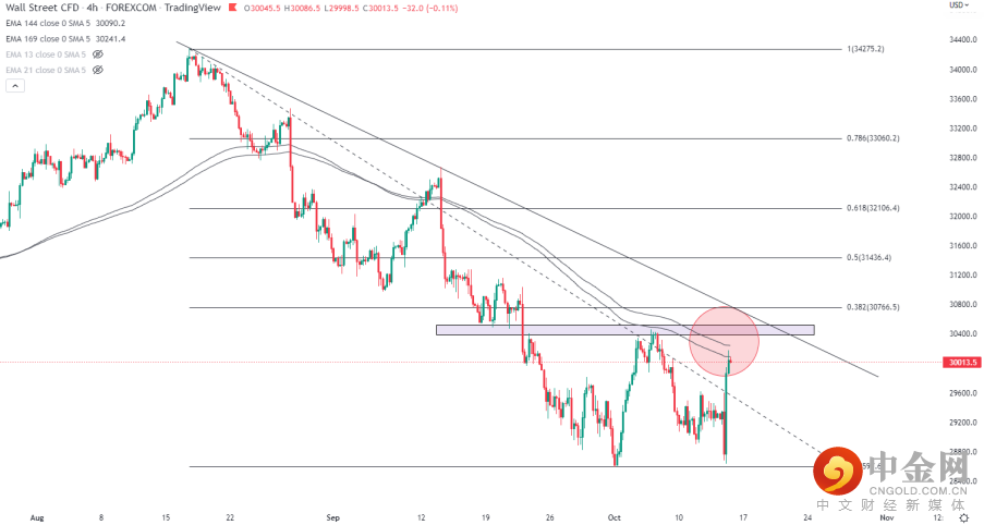 道指日内或将继续测试上方30350-30500的区域。不论是明确阻力后的回落(均线的压制作用不可忽视),或是突破后确立短线反弹行情,这里都是关键所在。不过,当反弹接近38.2%甚至50%回撤位附近时或面临更多压力。