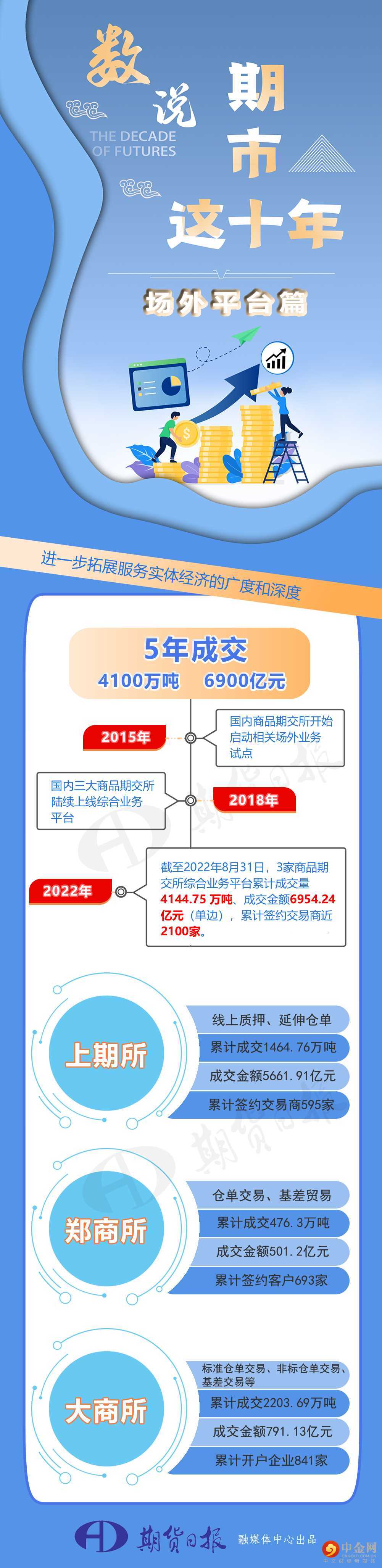 从无到有,国内交易所场外平台的推出与发展也是十年间期货市场服务实体经济的一项重要成果。2015年,国内商品期货交易所开始启动相关场外业务试点。2018年,三大商品期货交易所陆续上线综合业务平台(下称平台)。短短五年时间,通过对业务类型的不断丰富,对仓单交易、基差交易、“平台+”模式的持续探索,整体实现了从场内标准化交易向场内、场外协同发展的跨越,进一步延伸了服务实体经济的广度和深度。据统计,截至2022年8月31日,三大商品期货交易所平台累计成交4144.75万吨、成交金额为6954.24亿元(单边,下同),累计签约交易商近2100家。交易所场外平台已经成为场内市场的有益补充,完善期货市场对接实体经济的“最后一公里”服务,为产业行业实现高质量发展构建了强有力的风险管理防线。