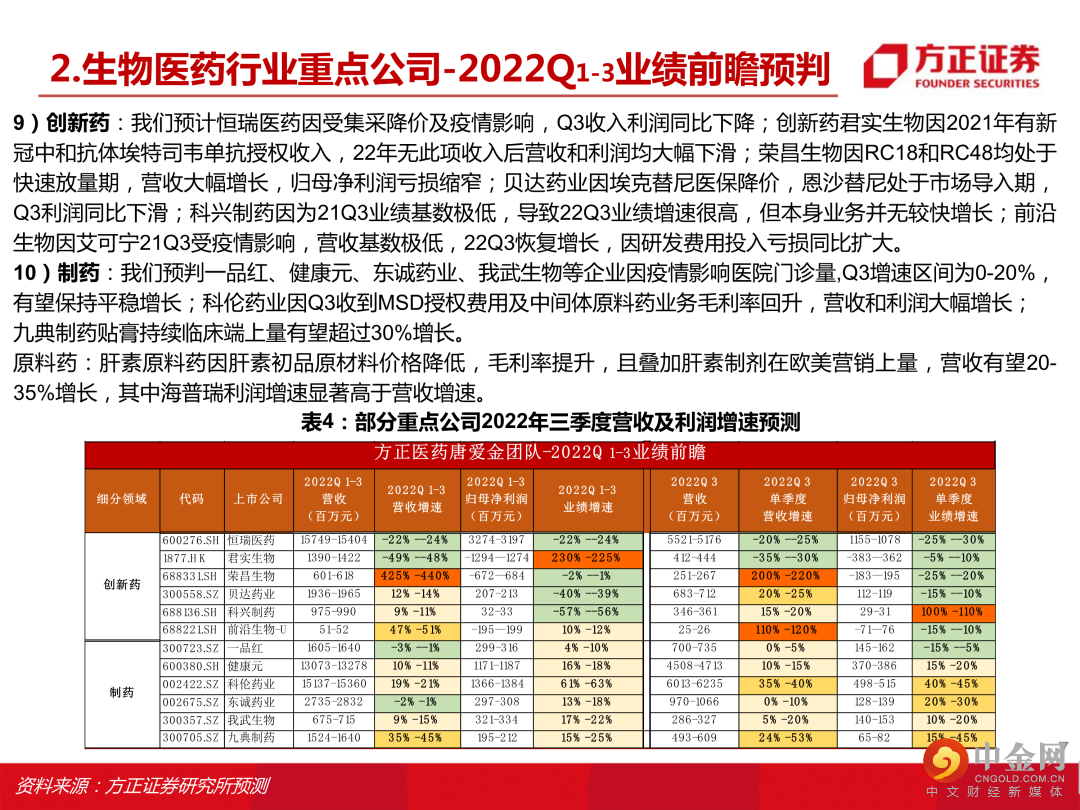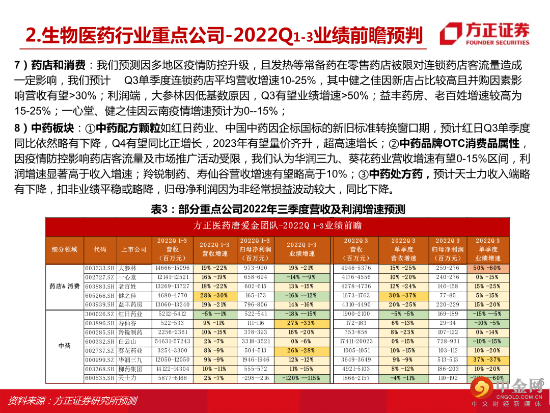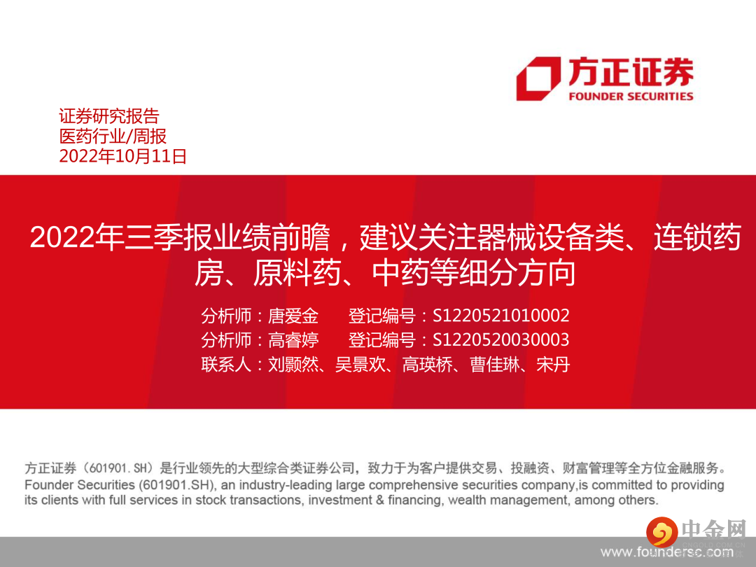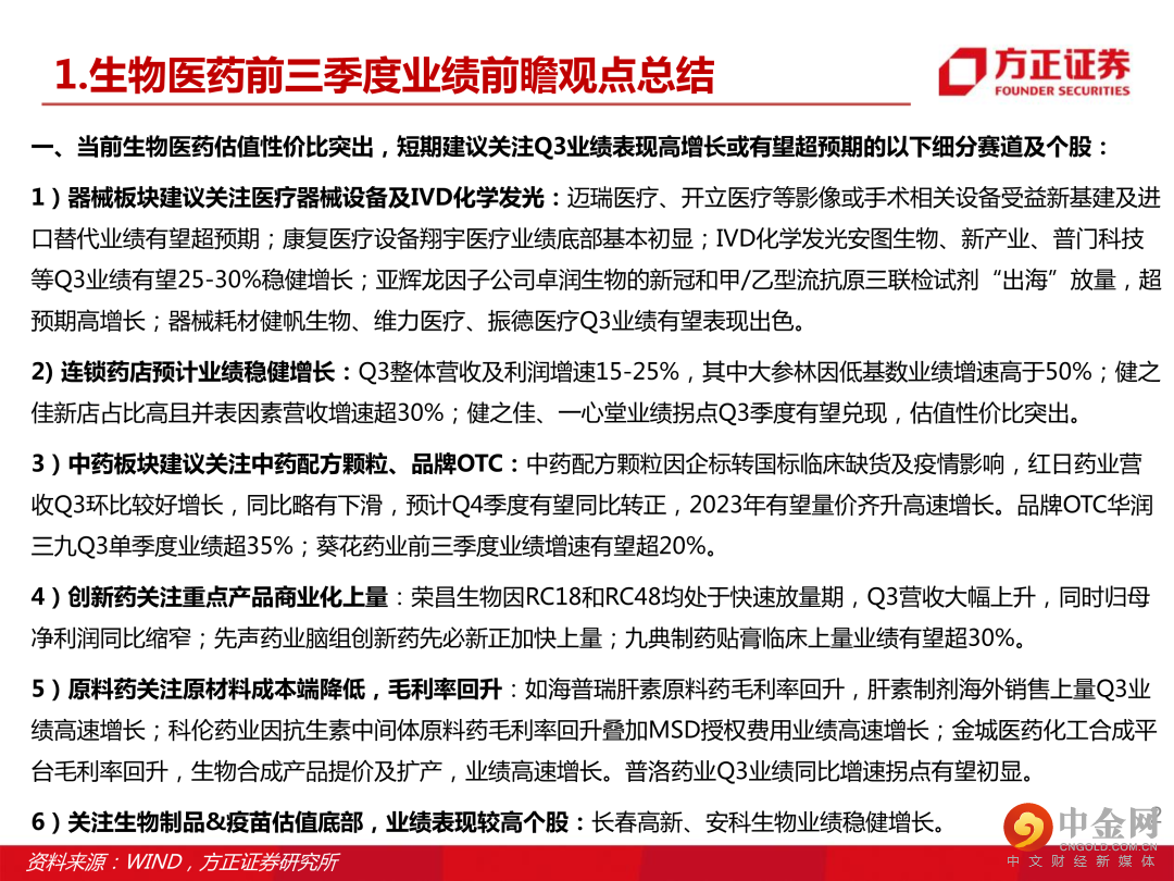本文来自方正证券研究所于2022年10月12日发布的报告《生物医药行业2022年三季度业绩前瞻,建议关注器械设备类、连锁药房、原料药、中药等细分赛道》