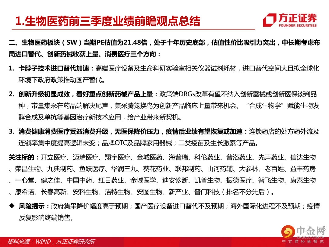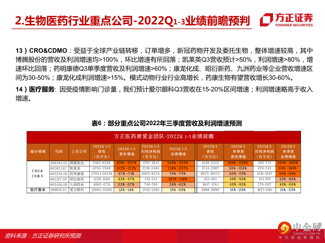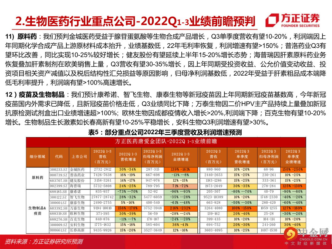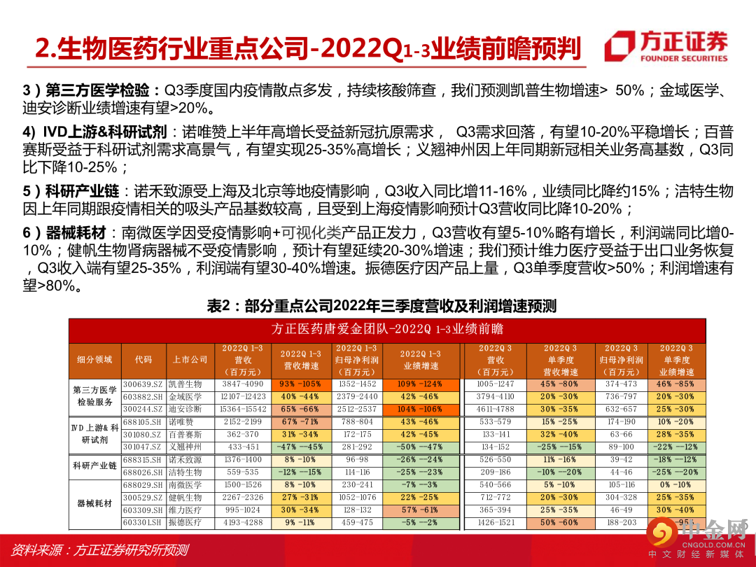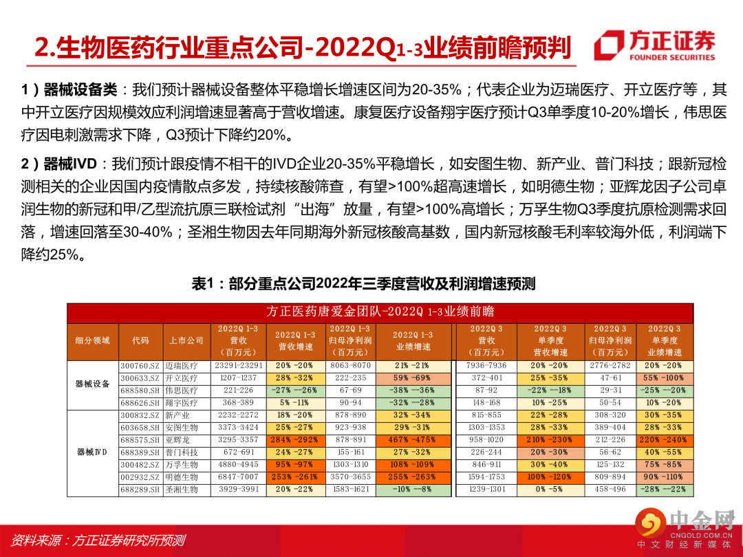 本文来自方正证券研究所于2022年10月12日发布的报告《生物医药行业2022年三季度业绩前瞻,建议关注器械设备类、连锁药房、原料药、中药等细分赛道》