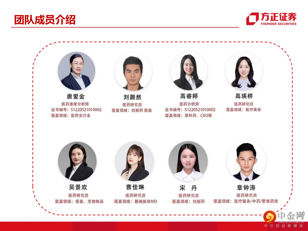唐爱金:浙江大学化学硕士,曾就职于东阳光药先后任研发工程师及营销市场专员,具备优异的药物化学专业背景和医药市场经营运作经验。曾经就职于广证恒生证券研究所负责医药团队卖方业务工作超6年,团队曾经获得“天眼”中国最佳分析师评选 2016 年医药行业第一名。