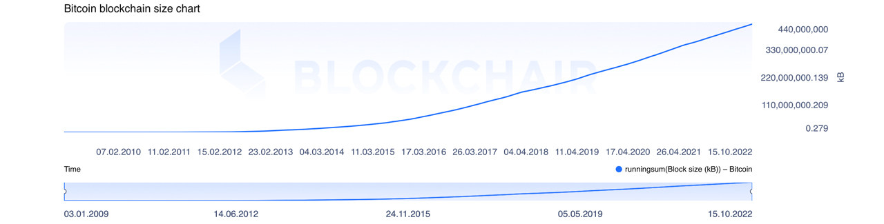 15 年 2022 月 XNUMX 日,比特币 (BTC) 区块链正在接近达到 500 GB 或大约 XNUMX TB 的空间,以便将整个分布式账本的历史存储在一个驱动器上。 在撰写本文时,存储整个 BTC 区块链需要超过 432,000 兆字节 (MB) 或 432 吉字节 (GB) 的空间。