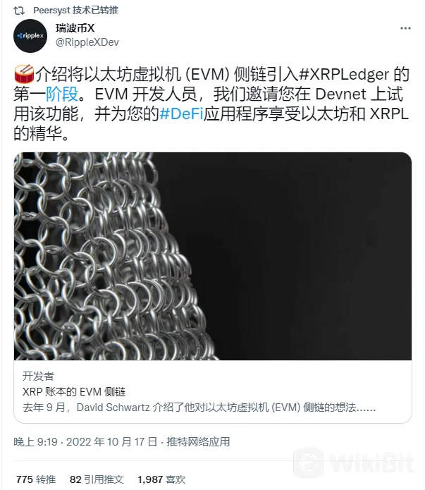 其实早在去年9月,Ripple 的首席技术官 (CTO) 和XRP Ledger的原始架构师之一David Schwartz介绍了他对以太坊虚拟机 (EVM) 侧链的想法。以将以太坊智能合约引入XRP Ledger (XRPL),并降低希望构建具有跨链互操作性的应用程序的开发人员的进入门槛。