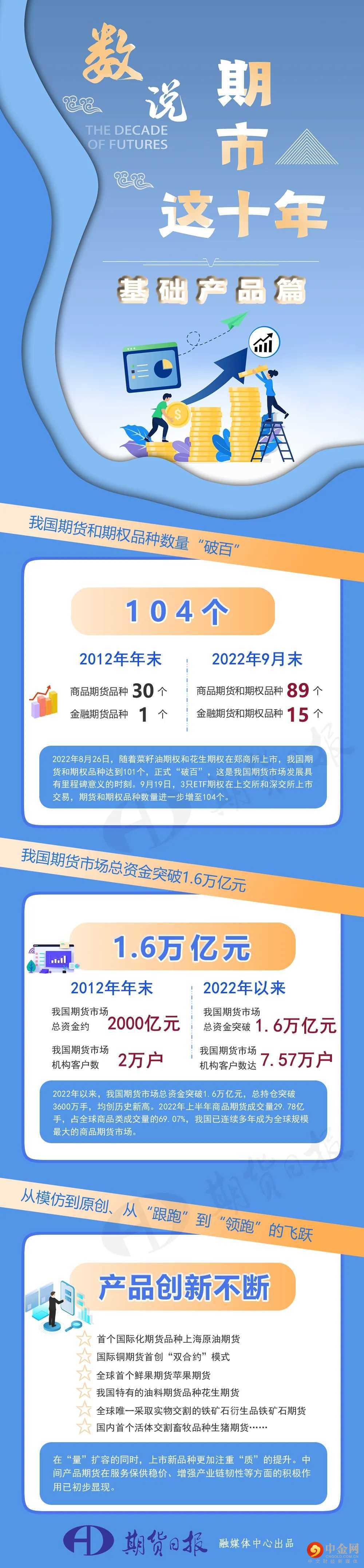 2022年8月26日,随着菜籽油和花生期权在郑商所上市,我国期货和期权上市品种数量达到101个,正式“破百”,这是我国期货市场发展具有里程碑意义的时刻。9月19日,3只ETF期权在上交所和深交所上市交易,期货和期权品种数量进一步增至104个。