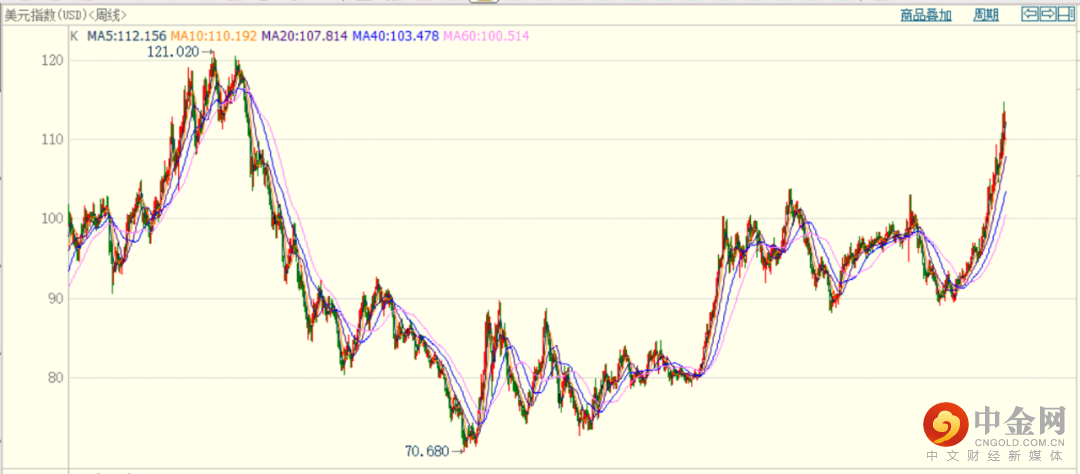 2013年美国经济终于走出了次贷危机阴影,国际竞争力再次逐步走强,美元指数从80一线开始走高并重回100以上,2016年年底见到了103.65高位。