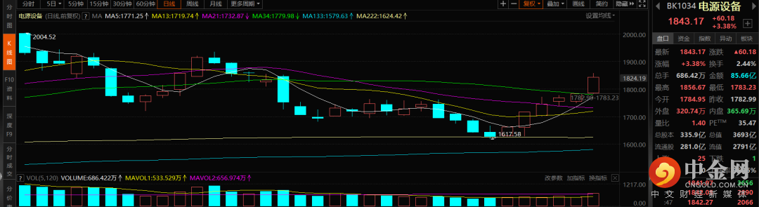 电源设备:新能源今日部分龙头业绩预告出来之后,全日强势,也带动着整个板块走强。就目前来看,新能源这个领域依旧是景气度较高且市场关注度也高的状态,叠加最近连续下跌之后的情绪反弹,也出现了部分资金进场的迹象 。从短期来看,虽然退潮来临没这么快,但是在反弹涨幅不小的情况下,需要谨慎。