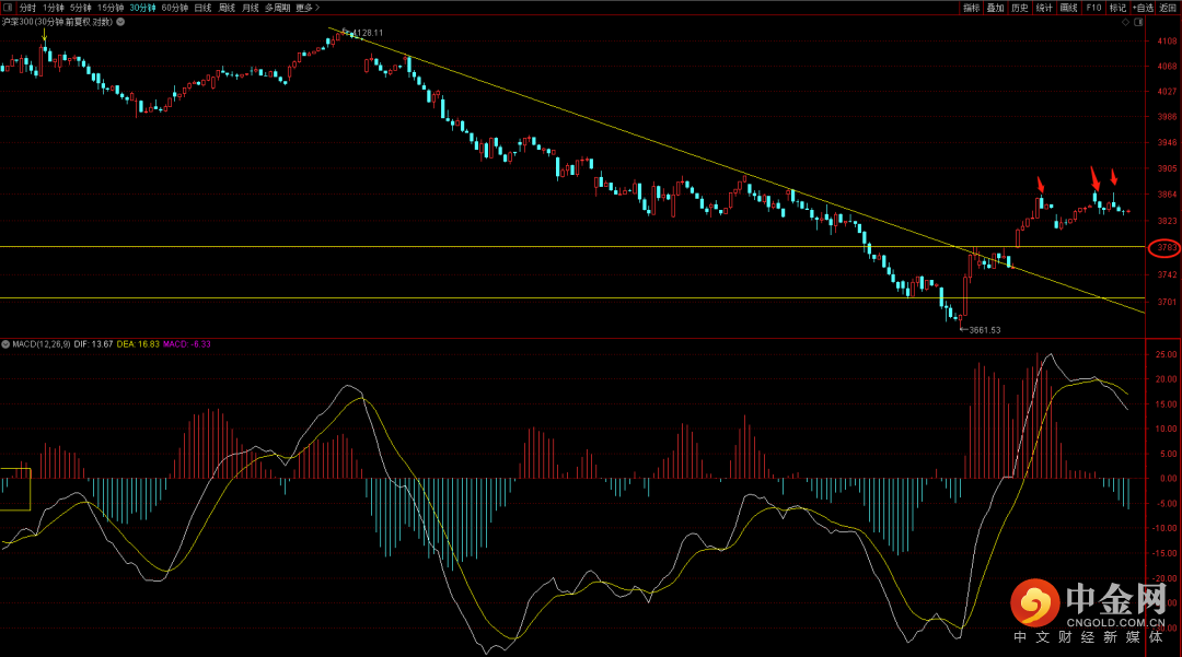 沪深300短期已经连续三次遇到3860附近后出现回落,短期这个位置有回落需求,关注3820点支撑,如果跌破则可能回至3756到3784这个区间。注意把控好低吸节奏。