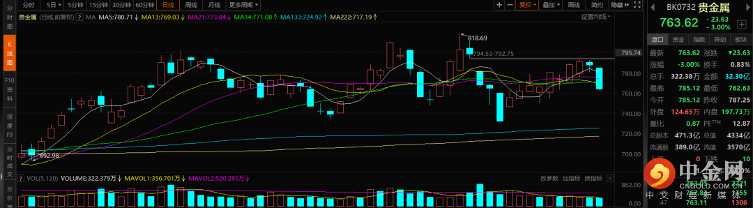 贵金属:近期国际金价的持续下行使得整个贵金属板块虽然受益于人民币汇率的因素跌幅相对较小,但是在今日也受情绪影响出现大跌。受制于美元指数强势的影响,后续金价的压力依然较大,对于相关板块不适宜抱有较高的期待,还是需要等待下一轮美元贬值带来的机会。