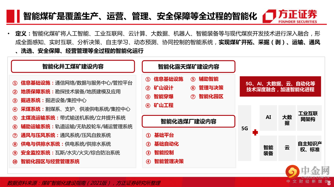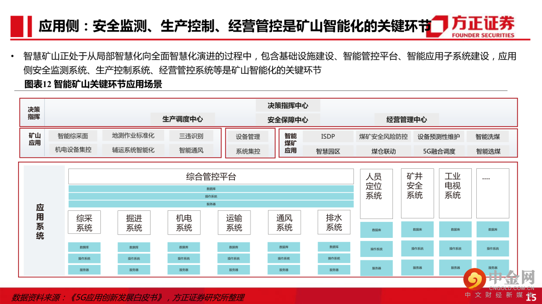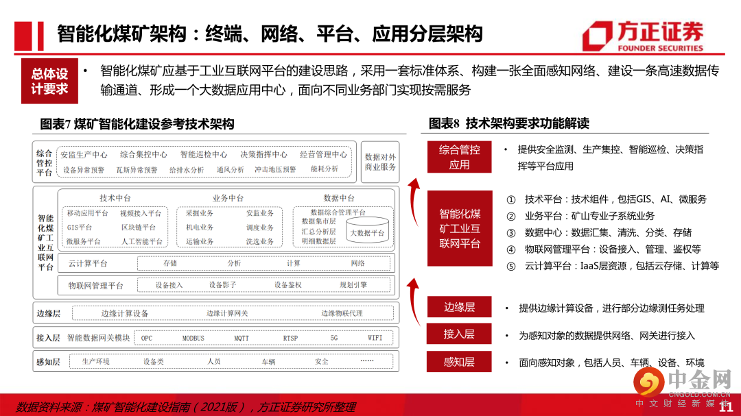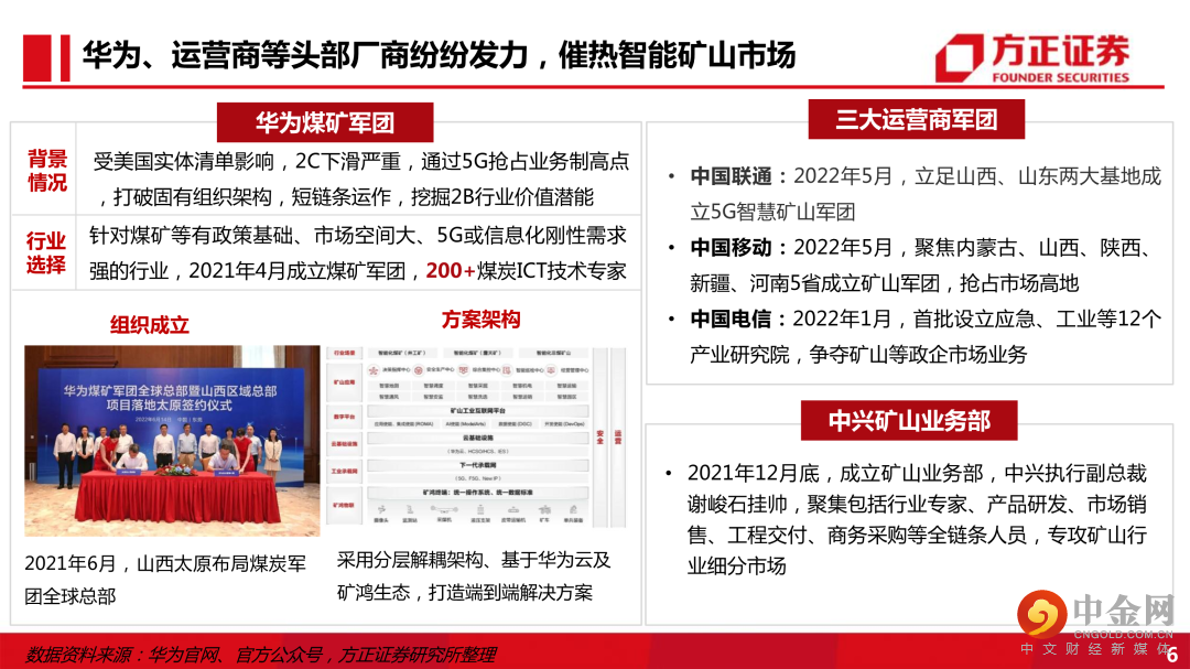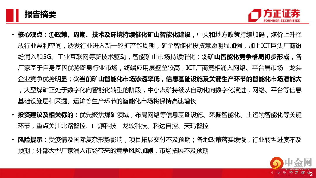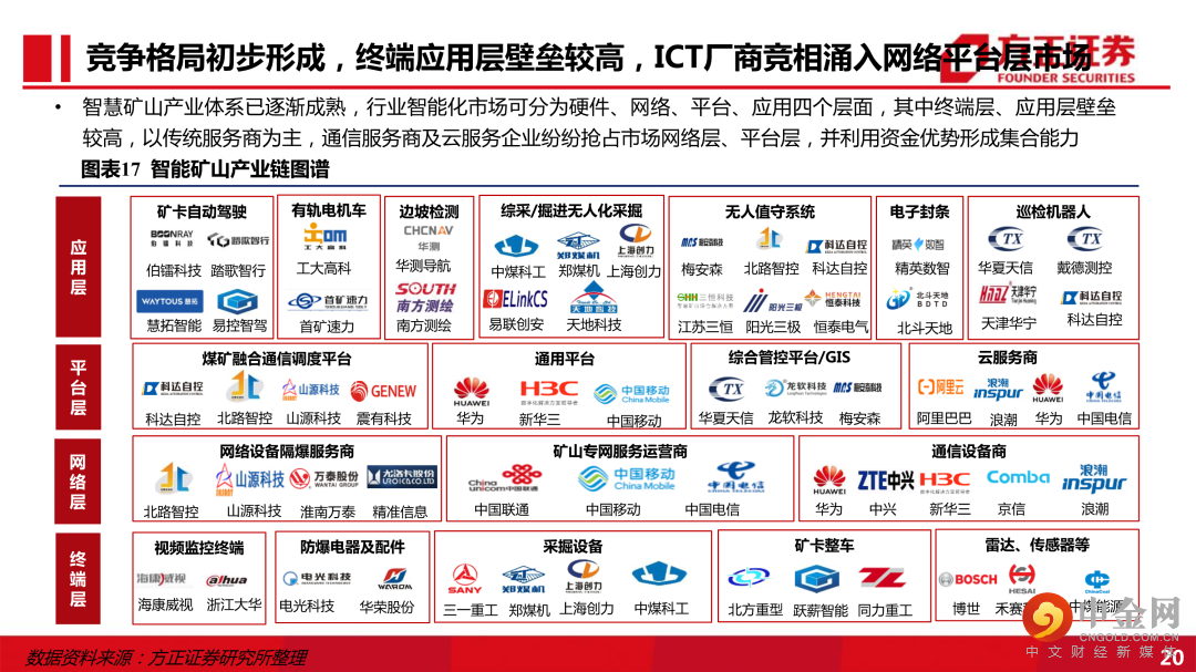 核心观点:①政策、周期、技术及环境持续催化矿山智能化建设,中央和地方政策持续加码,煤价上升释放行业盈利空间,诱发行业进入新一轮扩产能周期,矿企智能化投资意愿明显加强,加上ICT巨头厂商纷纷涌入和5G、工业互联网等新技术驱动,智能矿山市场持续催化;②矿山智能化竞争格局初步形成,各厂家基于自身基因优势跻身行业市场,终端应用层壁垒较高,ICT厂商竞相涌入网络、平台层市场,龙头企业竞争优势明显;③当前矿山智能化市场渗透率低,信息基础设施及关键生产环节的智能化市场潜能大,大型煤矿正处于数字化向智能化转型的阶段,中小煤矿持续从自动化向数字化演进,网络、平台等信息基础设施层和采掘、运输等生产环节的智能化市场将保持高速增长