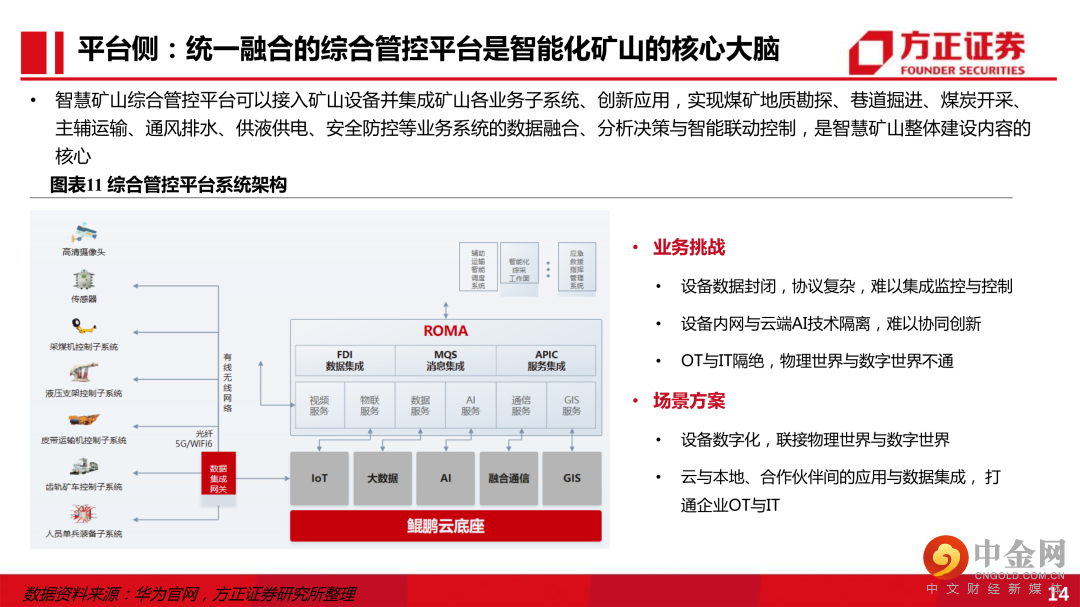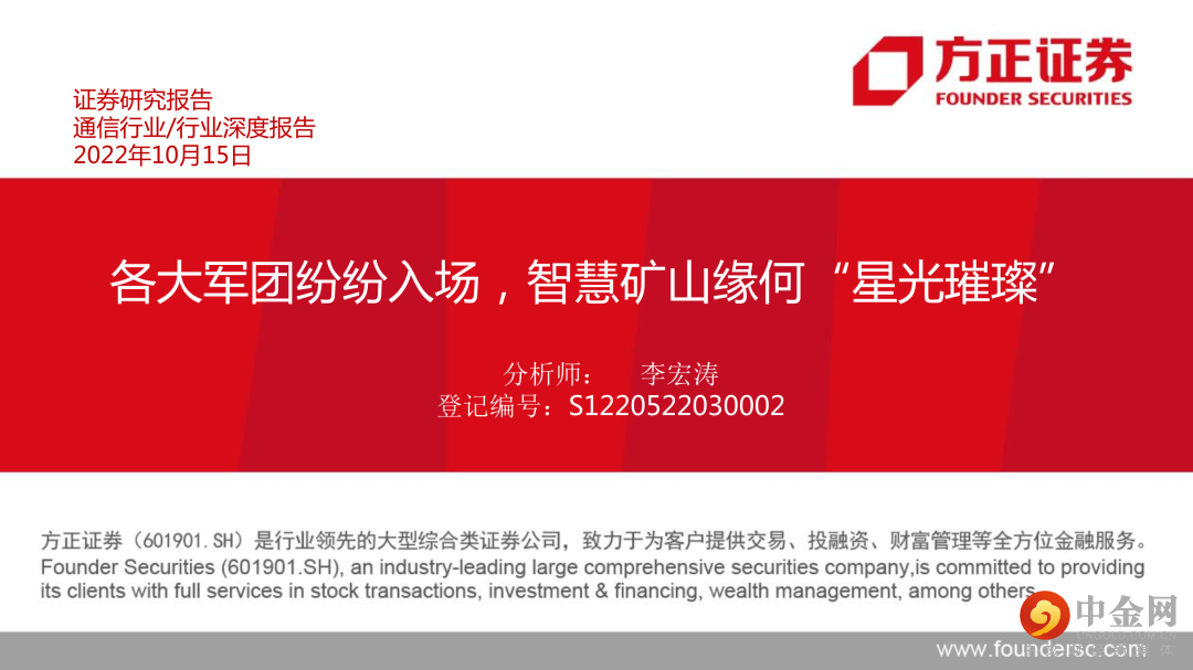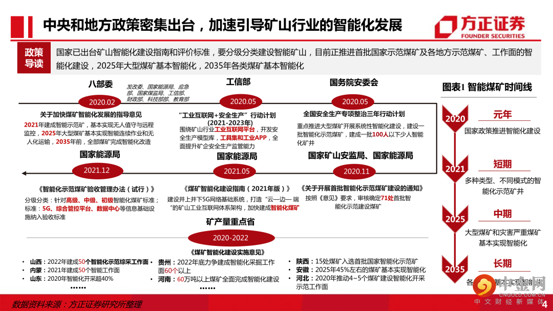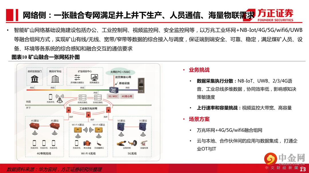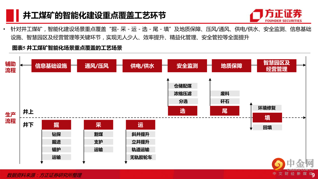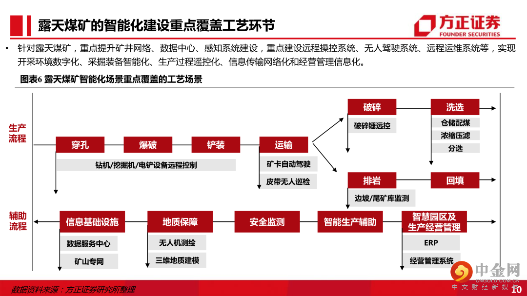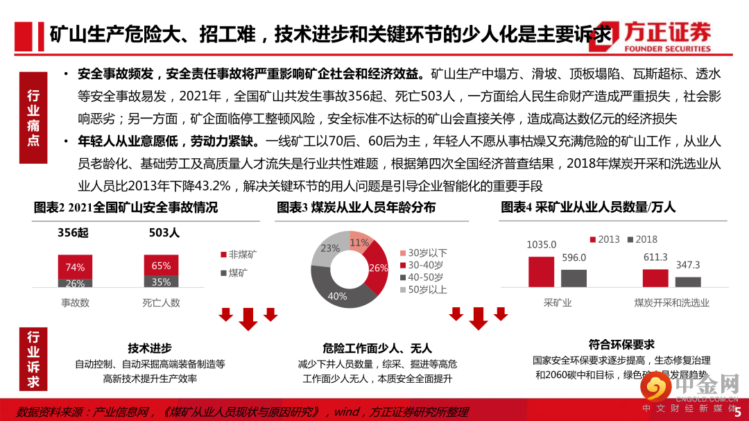 核心观点:①政策、周期、技术及环境持续催化矿山智能化建设,中央和地方政策持续加码,煤价上升释放行业盈利空间,诱发行业进入新一轮扩产能周期,矿企智能化投资意愿明显加强,加上ICT巨头厂商纷纷涌入和5G、工业互联网等新技术驱动,智能矿山市场持续催化;②矿山智能化竞争格局初步形成,各厂家基于自身基因优势跻身行业市场,终端应用层壁垒较高,ICT厂商竞相涌入网络、平台层市场,龙头企业竞争优势明显;③当前矿山智能化市场渗透率低,信息基础设施及关键生产环节的智能化市场潜能大,大型煤矿正处于数字化向智能化转型的阶段,中小煤矿持续从自动化向数字化演进,网络、平台等信息基础设施层和采掘、运输等生产环节的智能化市场将保持高速增长