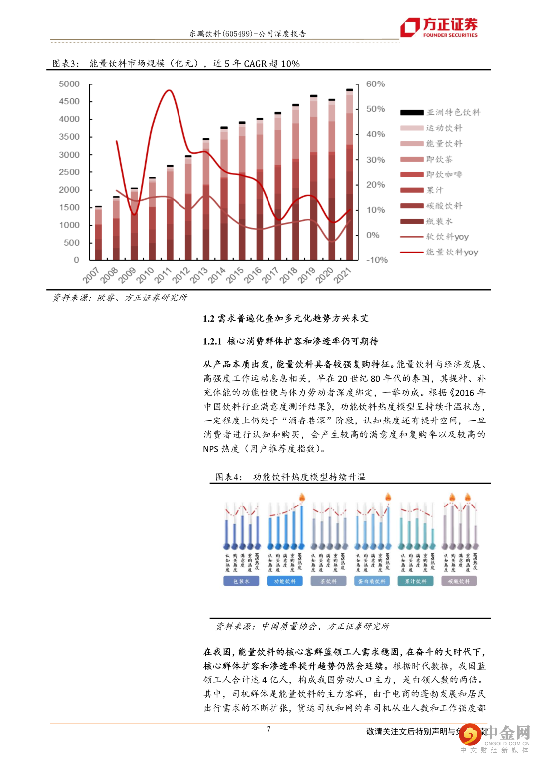 穿越周期,泛能量化趋势方兴未艾。能量饮料的强消费者粘性来自于强功能性,定性而言,其粘性高于包装水、口味型饮料,低于酒精等品类。这一特征赋予赛道穿越周期的稀有属性,推动能量饮料行业维持高速渗透,根据欧睿咨询数据,2007至2021年CAGR超过23%,近五年CAGR超过10%,2021年我国能量饮料的市场规模为513亿人民币,已逐渐接近我国碳酸饮料总规模。伴随时代背景下“能量+”新需求逐渐兴起,对标海外,未来能量饮料细分化、口味化、健康化将为趋势,消费人群和渗透率有望随之同步提升。