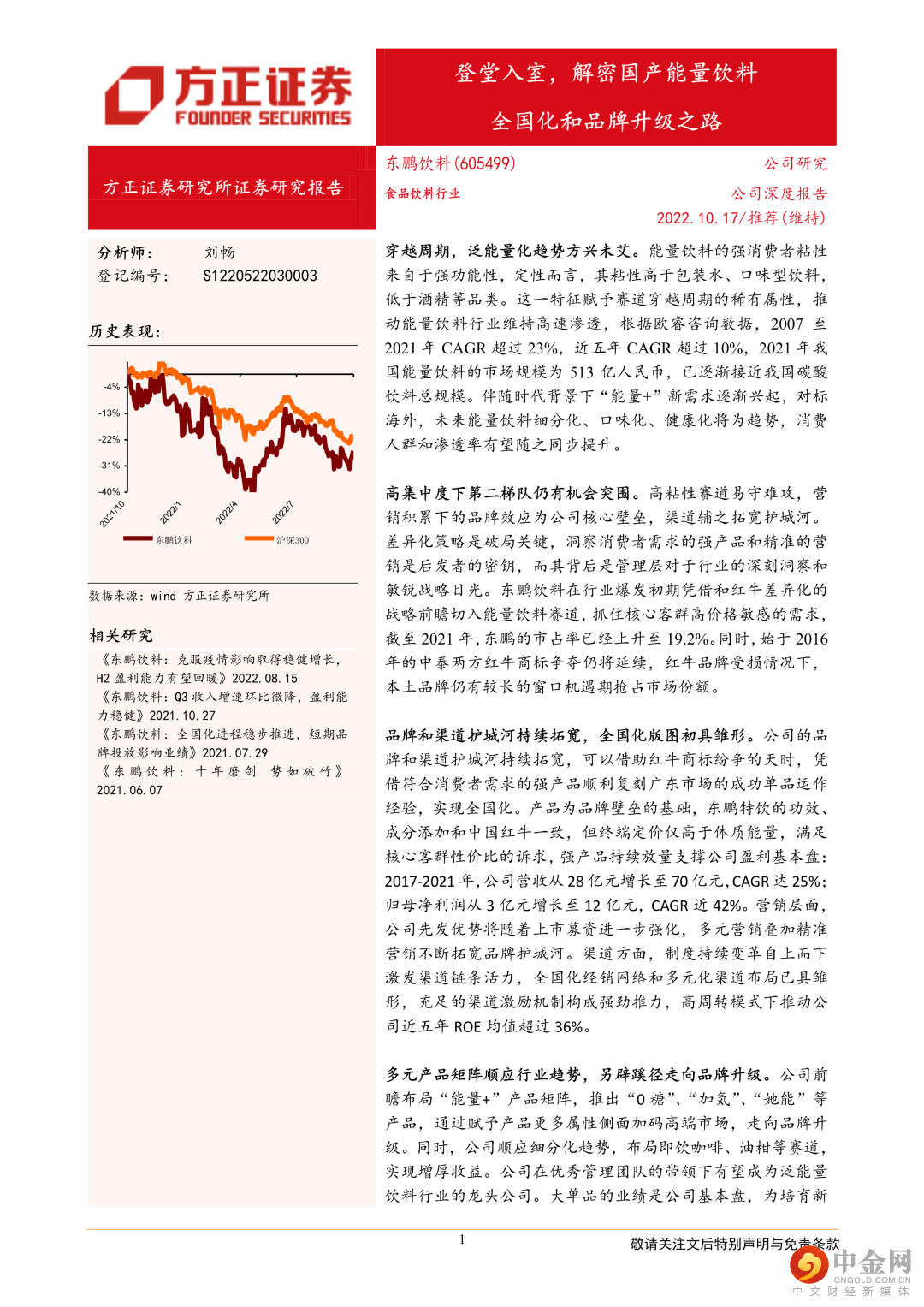 本文来自方正证券研究所于2022年10月17日发布的报告《东鹏饮料:登堂入室,解密国产能量饮料全国化和品牌升级之路》。