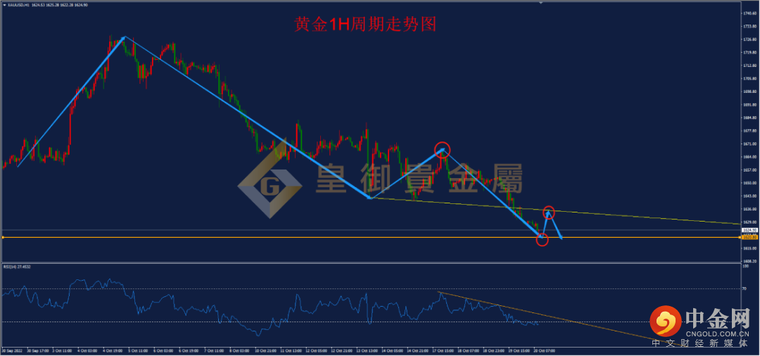 黄金1小时周期图可以看出,黄金自1729.0附近下跌,目前行情尚未止跌,昨日连续跌破多个支撑位,今日或将考验1620.0一线前期次低以及1614.0一线前低支撑,目前1小时级别RSI向下趋势线尚未破位,因此今日如有冲高受阻仍可做空,重点关注1620.0一线支撑,如果行情探底回升,并且RSI强势突破向下趋势线,则行情有望转折,在此之前,行情仍然偏弱,以做空思路为主。