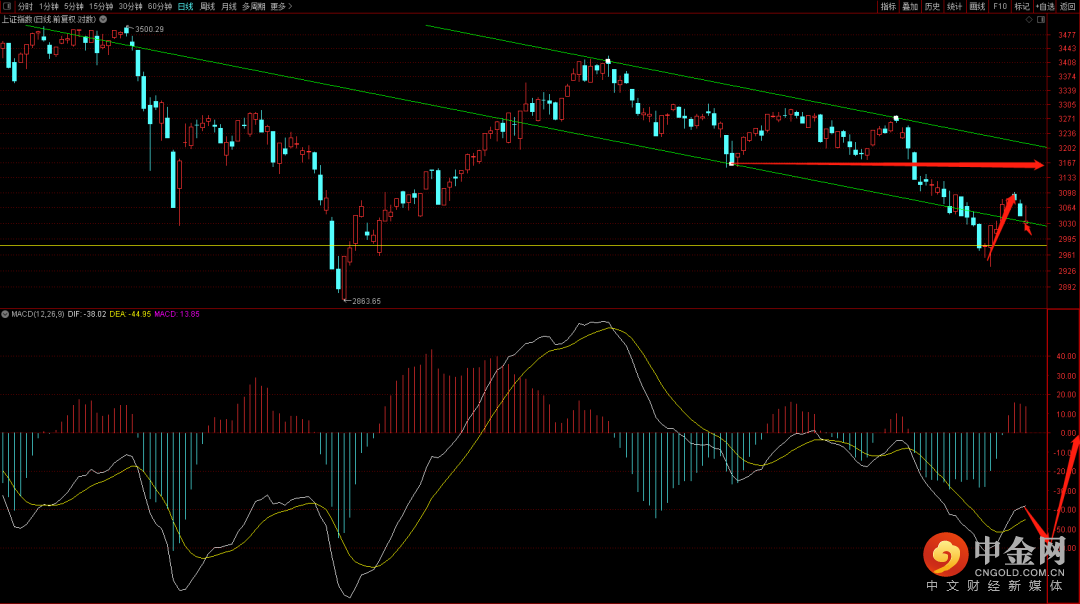 大盘跳空向下回补了前期的跳空缺口后出现拉升,但量能并不是太大导致拉升失败后再次回落,后续三天重点关注3013点是否会被跌破,如果再次跌破就可能回踩2980附近支撑,关注下周四可能出现的变盘窗口。