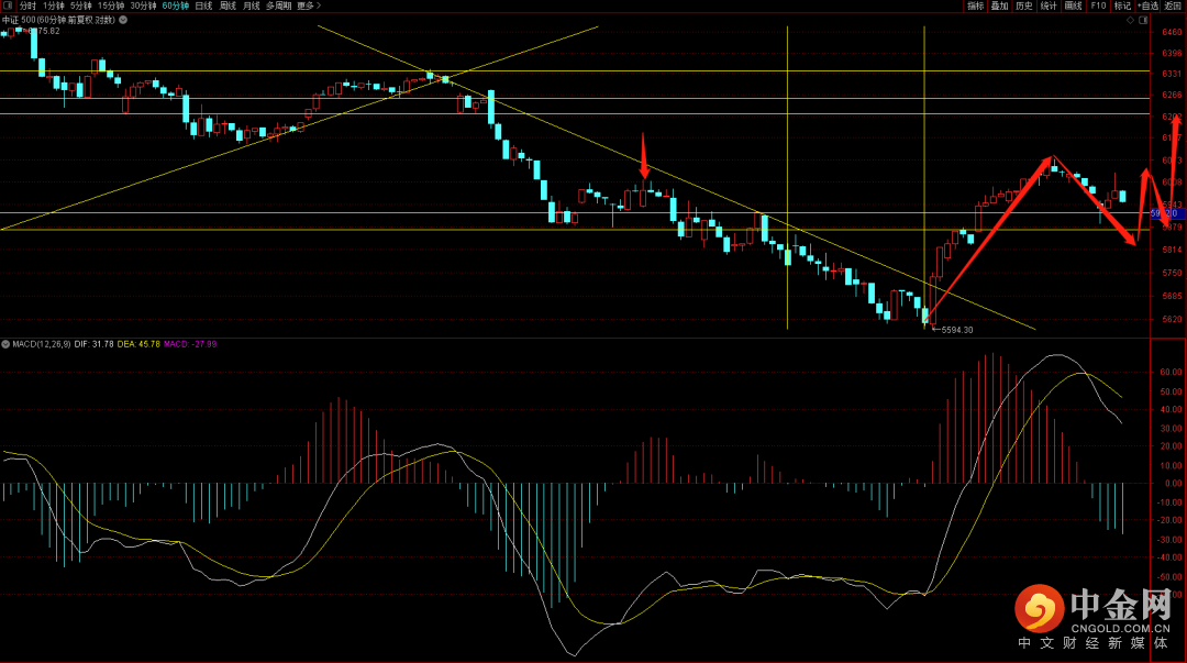 中证500表现相对强势,短期这个位置如果再次新高需要注意回避大概率会出现三十分钟与六十分钟的顶背结构,关注下方5820附近支撑,如果能够在这个位置附近出现企稳有望向上突破前期的下降趋势线。